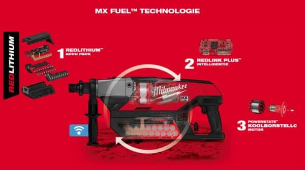 • Der bürstenlose POWERSTATE ™ -Motor der nächsten Generation von MX FUEL ™, die REDLINK PLUS ™ -Elektronik und der REDLITHIUM ™ -Batterie bieten überlegene Laufzeit, Leistung und Haltbarkeit auch bei härtesten Anwendungen